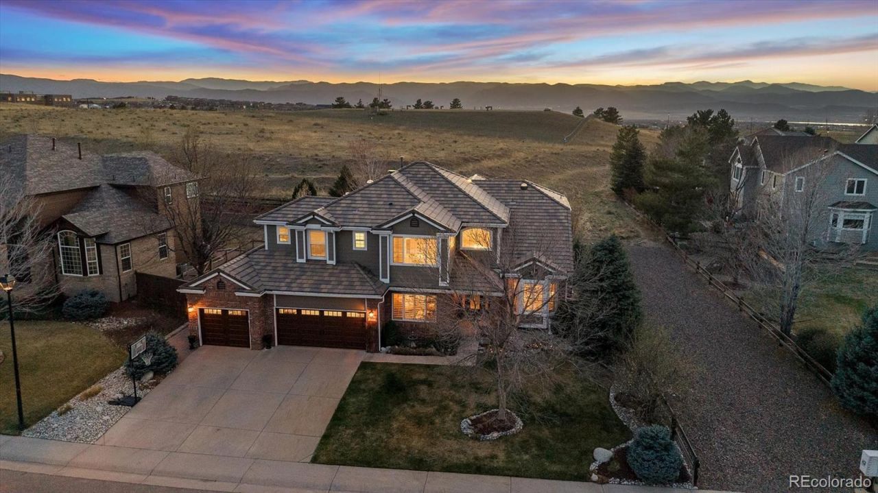 Unparalleled Move-In Ready Home Backs/Sides to Open Space w/Views of Mt Blue Sky! Rare chance in coveted Kentley Hills: 4 Bed+Main Floor Office, 4 Bath features thoughtful custom upgrades including molding/wainscoting/archways thruout! Impressive curb appeal: New upgraded garage doors, covered front porch w/upgraded door, concrete tile roof, mature trees. Soaring vaulted ceilings in grand Foyer, Living & Family Rooms. Newly refinished hardwood floors thruout home! Truly exceptional, reimagined Gourmet Kitchen boasts custom cabinets: lit uppers w/crown molding, lower drawers, massive custom island. Elevated finishes include Taj Quartzite counters, full tile walls, floating walnut shelves, farmhouse sink & stylish lights. Newer hi-end SS appliances: gas cooktop/hood, double ovens, refrigerator, microwave, dishwasher, wine cooler. Spacious Family Room w/gas fireplace, nook w/TV & 2-story windows to enjoy mtn/open space views! Formal Living & Dining Rooms offer more space. Sizeable Office has French doors, expanded built-in shelves; sits near revamped 3/4 Bath w/custom tile, wall shelves. Laundry is smartly redone: custom cabinets/drawers, quartz folding counter, W&D stay! Added hall pantry, closet & built-in shelves for storage. Unwind in Primary Suite w/mtn views & attached spa-like 5-pc Bath; superbly updated w/expanded shower, dual custom vanities, jetted tub, heated tile floors/towel rack, His/ Hers walk-in closets. Bonus natural light via light tubes! Bed 2 has private full Bath; Beds 3 & 4 share redone full 4-pc Bath. Love the ultra-private Back Yard featuring custom stone patio w/gas lines for fire pit & BBQ, garden areas & gorgeous landscaping. Oversized 3 car finished garage w/new openers, cabinets/shelves, fridge. Newer hi-efficiency HVAC, reverse osmosis H2O system, upgraded blinds, newer back windows, H2O heater (2018). Walk to top-rated Summit View Elem, Mtn Vista HS; near Valor HS, STEM School. Miles of trails! Low quarterly HOA. Highly cared for home!