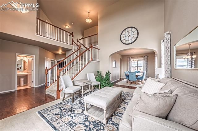 Stunning two-story, single-family home, nestled in the highly sought-after community of Meridian Ranch. This sprawling floorplan, with a finished, walk-out basement, spans over 3600 square feet, offering 5 bedrooms, 4 baths, two car garage, two family rooms, formal living/dining room, office, and a new 45,000 sq. ft. clubhouse just steps away. Entry welcomes rich hardwood flooring and a myriad of windows flooding the space with an abundance of natural lighting. Living room flows seamlessly into the formal dining room with hardwood flooring, bay window and arched access into the eat-in-kitchen offering granite counters, solid wood cabinetry, Island and breakfast bar, recessed lighting, Stainless Steel appliances, outdoor access to the deck, and a pantry. Main level Family Room adjacent to the kitchen does not disappoint with 18’ ceiling, stacked-stone gas fireplace, and built-ins for entertainment. Sizable office and powder room completes the main level. The thoughtfully designed upper level gives a feeling of opulence as it overlooks the main level family room, formal living room, and entryway. Large Primary Retreat with vaulted ceiling, walk-in closet, and en-suite with soaking tub, separate shower, double vanity, tiled flooring, and water closet is a perfect reprieve after a long day. Rounding off the Upper level are two additional bedrooms, full bath and upper-level laundry room and storage. The finished, walk-out basement expands living space with two additional bedrooms, full bath, plenty of storage, and an enormous Family Room with wet bar and outdoor access to a cover patio. Additional features include, Central Air, Formal Dining, second level laundry, vaulted ceiling, 18’-20’ ceiling, composite deck, covered patio, plenty of storage, multiple areas for eating/entertaining, and room to grow. Community features offer, clubhouse, a new clubhouse next door scheduled to open in Fall of 2025, hiking/biking trails, parks and open spaces, pools, and schools.