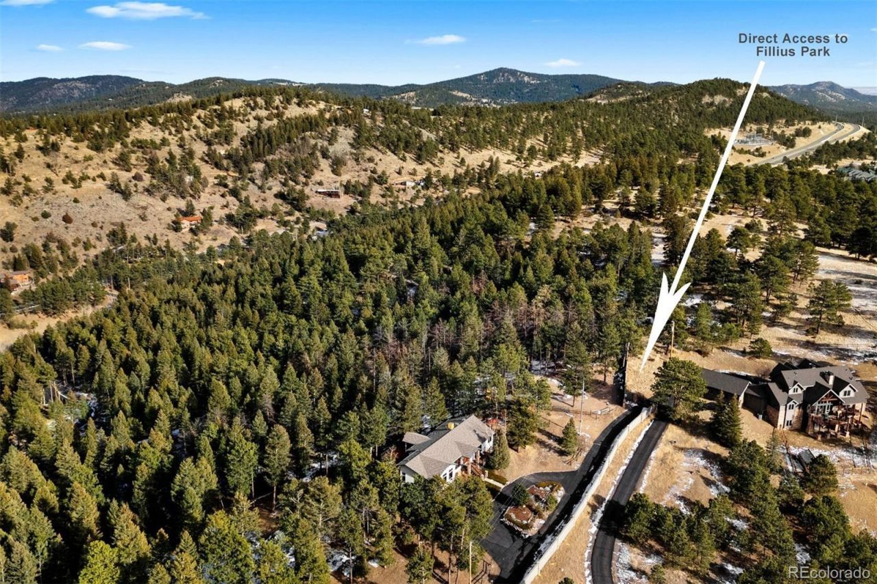 Set on a coveted Soda Creek lot with panoramic 360-degree mountain views, this exceptional Evergreen residence offers a refined take on foothills living. Walls of windows frame expansive vistas of the Continental Divide and surrounding peaks, bringing in consistent natural light and a strong connection to the landscape. Classic rustic mountain architecture is expressed through exposed beams, custom sliding barnwood doors, and ideal southern exposure.The main level is designed for functionality and flow, featuring an open-concept great room and kitchen, both oriented to capture the views and well suited for daily living and entertaining. Three bedrooms are positioned to provide separation and privacy, including a main-floor primary suite with a gas fireplace, steam shower, radiant floor heating, a large walk-in closet, and direct deck access.The lower level supports a variety of uses, with two additional bedrooms. One is an oversized suite with a walk-in closet and private ensuite bath. The level also includes a gym, media room with wet bar, and walk-out access to a patio and fenced yard. An expanded deck off the kitchen creates additional outdoor living space, complete with a six-person hot tub and ample room for dining and seating.Recent fire mitigation has been completed, while also enhancing sightlines and usable outdoor areas. The property includes DIRECT access to Fillius Park Open Space, offering immediate proximity to trails for hiking, riding, and access to the local school. Wildlife, including elk, deer, and wild turkeys, are regularly seen in the area.Equestrian features are well integrated into the property; these include an upgraded barn, riding arena with sand footing, round pen, paddocks, and over two acres of high-tensile fencing designed for both horse and wildlife safety. Originally part of a historic cattle ranch, Soda Creek is known for its larger parcels, open land, and convenient access to Bergen Park amenities and I-70.