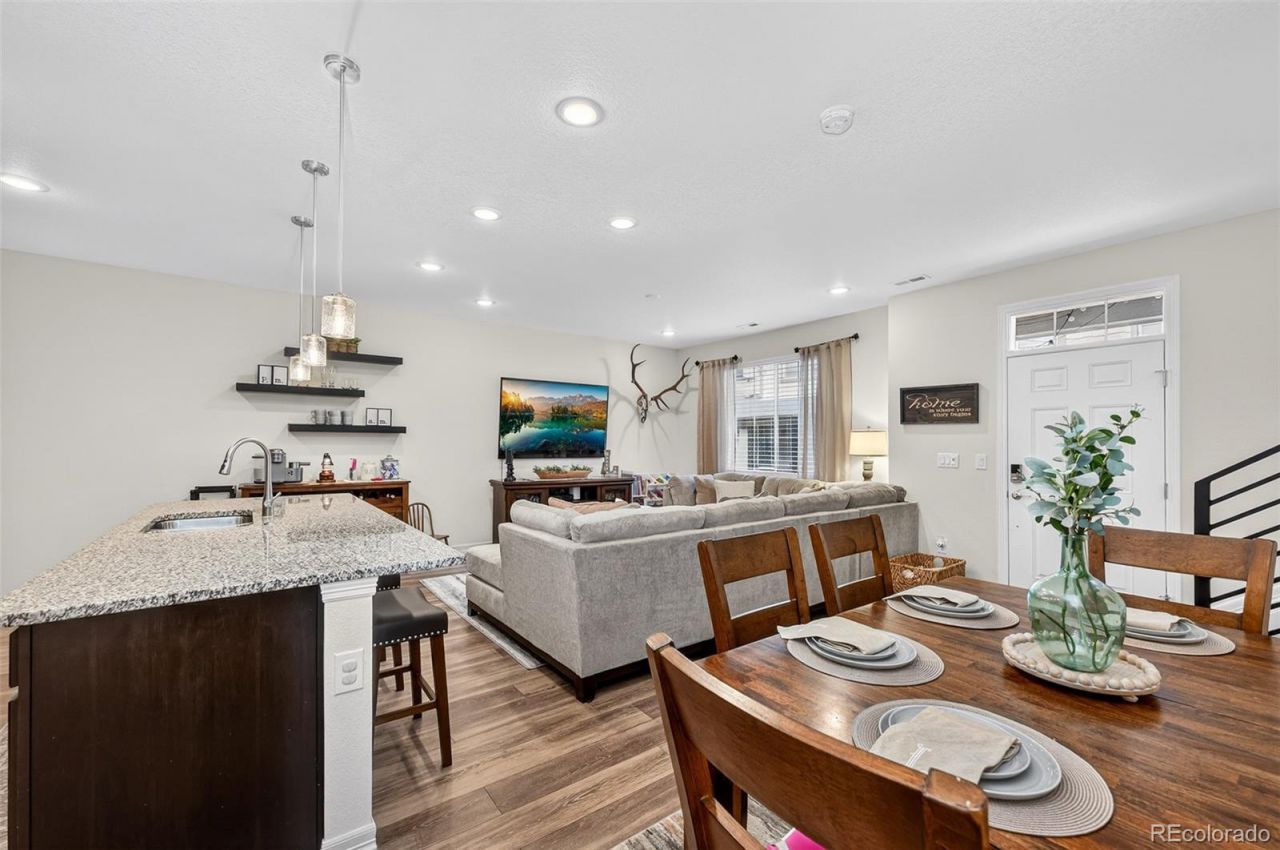 Welcome to this charming, impeccably maintained townhome in the desirable Buffalo Run East community. Thoughtfully upgraded to meet todays buyers expectations, the home features luxury vinyl plank flooring throughout the entire main level. The kitchen is beautifully appointed with rich cabinetry, a pantry for ample storage, an expansive island with granite countertops, and stainless steel appliances?all included. The spacious family room easily accommodates a large sectional and accent tables, while a dedicated dining area provides the perfect setting for dinners or entertaining family and friends. Just off the staircase, an upgraded office nook offers an ideal space for remote work, homework, or creative projects. Upstairs, retreat to the true primary suite showcasing a bright, generously sized bedroom, walk-in closet, and a stunning en suite bath with dual sinks and an oversized shower. Two additional bedrooms and a full bathroom complete the upper level. Additional highlights include storage under the stairs, in the garage, and within the vapor-barrier?protected crawlspace. Enjoy weekends on the fairways of Buffalo Run Golf Course or explore nearby dining and shopping options just minutes away at the Prairie View Shops. Conveniently located only 10 minutes from Denver International Airport and about 20 minutes to Downtown Denver for games, concerts, and city nightlife. Schedule your private showing today and experience all the lifestyle this home has to offer.