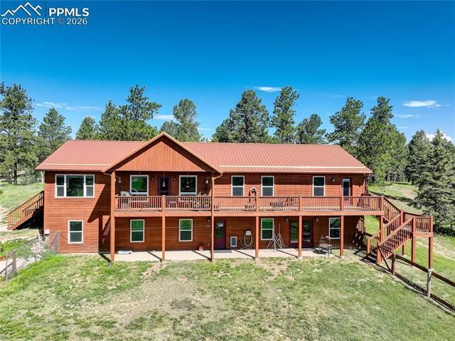 Welcome to your mountain dream home, where unobstructed Pikes Peak views greet you each morning, are visible through many windows and add a breathtaking inclusion to the spectacular sunrises in the morning. This spacious 4680 sq ft, 5-bedroom, 4-bathroom home, located in Divide Colorado, is nestled on a fenced-gated 38.68-acre property, where it provides the perfect blend of grassy meadow and heavily treed terrain with a creek that runs through and often draws the local wildlife to come visit. Inside this impressive home, you will discover a showstopping kitchen that would make any cooking enthusiast smile. Featuring gorgeous- engineered stone countertops, ample cabinets with soft close hinges and convenient pull-outs, a center island with a prep sink and beverage fridge, a walk-in pantry, and a convenient built in desk! Rich hardwood flooring flows throughout the main living areas, adding warmth and timeless elegance to this light and bright space. Generous sized bedrooms include walk-in closets, providing amazing storage options throughout. The primary bedroom includes a spacious ensuite bathroom with a tiled walk-in shower, bench seat and dual shower heads, a double vanity, an impressive walk-in closet and access out to the deck. The walkout lower-level houses a large office/multi use space, media room, and so much more. Outside, the large, covered deck and covered patio provide year-round enjoyment, whether you are sipping coffee with those jaw-dropping Pike’s Peak views or watching wildlife wander through your meadow. The detached 2 car garage is oversized at 750 sq ft and your 1024 sq ft barn boasts a loft, concrete floors, a wood burning stove, three 220 outlets, and a lean-to for additional storage making it the perfect space for a workshop, your hobbies, or whatever your heart desires. Thoughtful improvements such as a generator interlock system at the pole located close to the propane tank make you prepared whatever the weather. Strong cell service at home