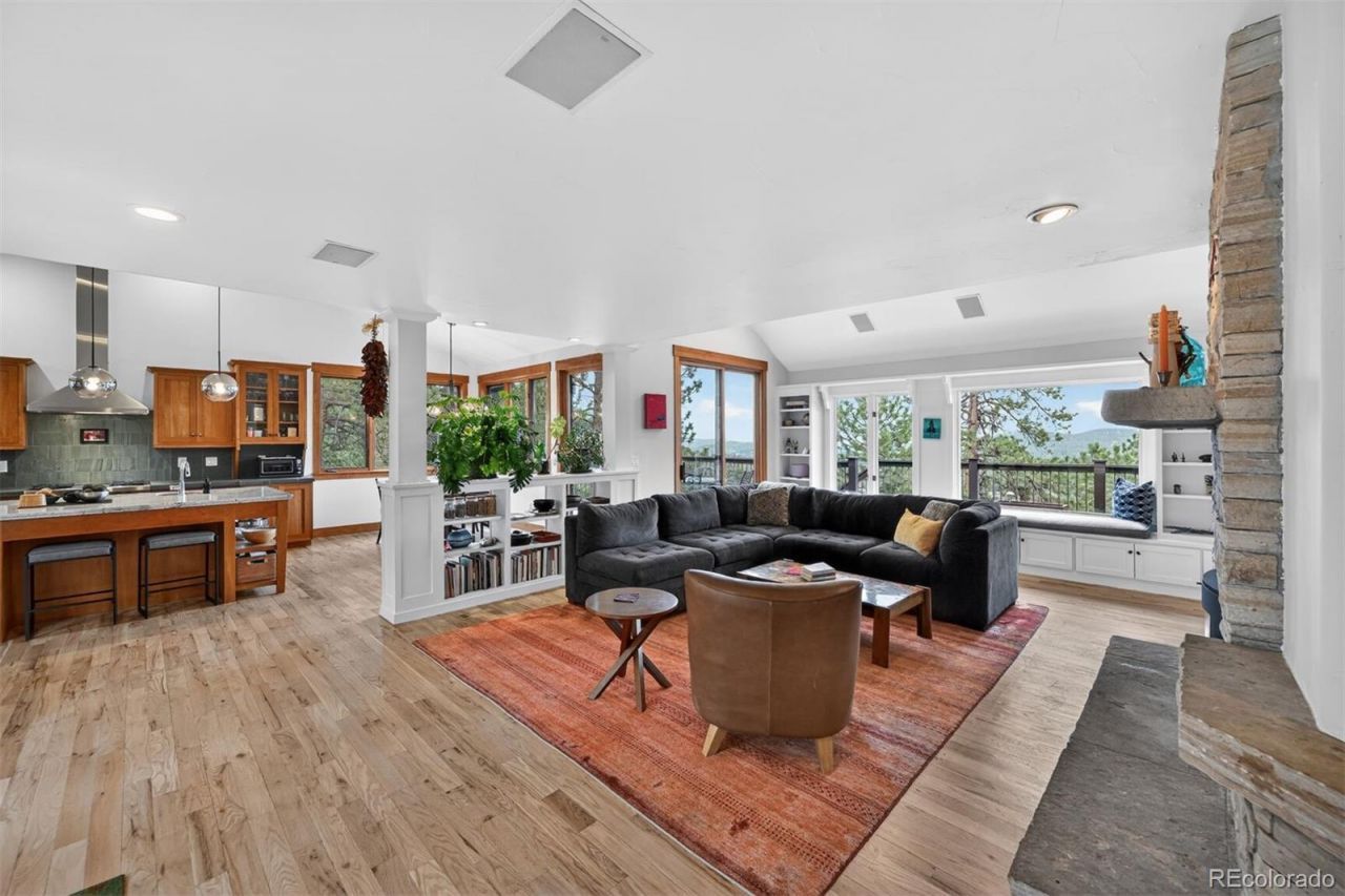 One exceptional North Evergreen property offering over 30 acres of pristine mountain living?featuring a stunning primary residence on 21.74 acres plus two additional lots, the existing house has its own well and the other two lots transfer with permits. Whether you want to consider subdividing, creating a multi-generational estate, or simply enjoying the full expanse yourself, this rare offering provides unmatched flexibility and opportunity. Perfectly positioned to capture sweeping mountain and valley views, the home showcases Colorado living at its finest. The main level welcomes you with a warm foyer and beautiful white oak hardwood floors that lead into a breathtaking great room. The eat-in kitchen impresses with soaring vaulted ceilings, rich cherry cabinetry, high-end appliances, and a functional granite-topped island. A striking wood-burning stove with stone surround adds charm, while expansive windows and easy access to the deck invite you to take in the incredible scenery. Two additional slate patios offer serene outdoor retreats. The main level also includes a private office and two spacious bedrooms, each with en-suite full baths. Upstairs, the primary suite is a true sanctuary with vaulted ceilings, exposed beams, a cozy window seat, and a double-sided wood-burning fireplace shared with a private sitting area. The luxurious five-piece bath features custom natural stone tile work and vaulted ceilings. The finished basement adds versatility with a comfortable family room with wood burning fireplace, guest suite with ¾ bath, built-in workspace, and two bonus rooms?ideal for a gym and additional office. Additional highlights include an oversized four-car garage with heated workshop, a barn converted into a heated art studio, owned solar panels, two Tesla Power Stations, and space for an in-ground hot tub. Conveniently located just minutes from I-70 and Evergreen, this property seamlessly blends opportunity, quality, and convenience. Truly one of a kind.