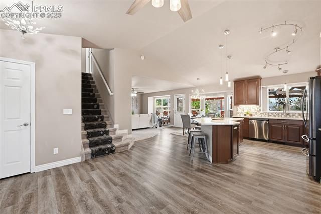 As you pull up to this home, you'll see the fully xeriscaped front yard with concrete border. When you step inside you'll be greeted with an open floor plan with so many features you will be amazed. Smart features include things like lighting, shades, fireplace and thermostat that you can customize to your hearts content. The shades are motorized so you don't have to use the smart feature if you don't want to. This home has been fully updated in recent years and will bring you many years of enjoyment without having to do a thing. The kitchen is a dream to cook & entertain in. Your guests can enjoy your company at the island while you prepare food. The black stainless appliances are included. The double oven makes meal prep even better. Off the living room is a wonderful sun room with a mini-split for temperature control. With central A/C and 6 ceiling fans, you'll stay cool all summer long. Imagine enjoying the the huge covered deck (2-20x15 &12x12) in the backyard during the summer. As you wander up the stairs, the large primary bedroom has an ensuite bathroom with double vanity, large free standing shower large walk in closet and hookups for a stack-able washer & dryer. Two more bedrooms upstairs & a full bathroom as well. The garage entrance has a coat closet & a half bath with another set of washer/dryer hookups. The basement has an additional room that can be used as an office or hobby room. The basement has bathroom and a HUGE family room/rec room area with storage as well. If you want another bedroom, you can add a wall & a door. The entire yard has an automatic drip system and sprinkler system so you never have to worry about watering. The backyard has a lawn area and more xeriscaping. A huge RV carport is included for your toys! Two sheds are also included. The roof is a class IV shingle and there are gutter guards, so no gutter cleaning! The metro district you are a part of has swimming, exercise rooms, pickleball courts & more. Don't miss this one!