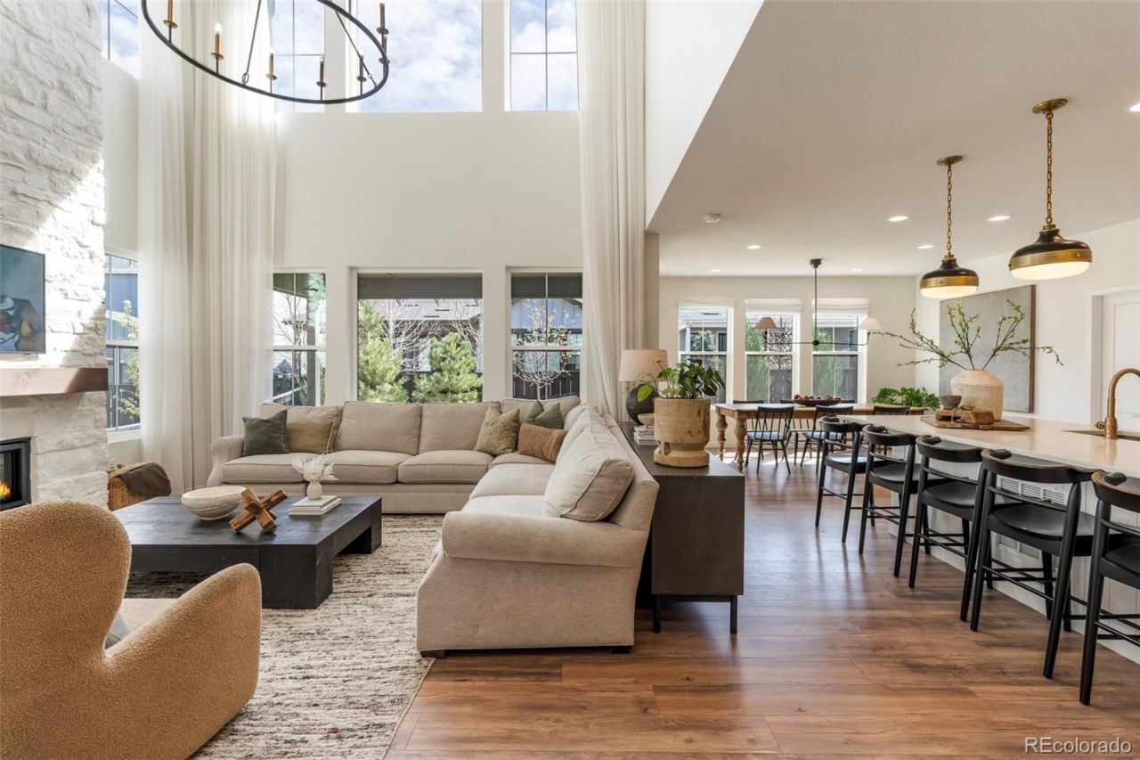 This stunning Solstice residence offers elevated design and a coveted location just moments from the community pool, rec center and Chatfields endless outdoor recreation. Thoughtfully curated with designer finishes throughout, this home welcomes with a covered front porch and a light-filled interior anchored by dramatic two-story ceilings and a custom floor-to-ceiling stone fireplace finished with German schmear and a wood mantel. The open-concept layout flows into a beautifully appointed kitchen featuring upgraded cabinetry with new hardware, a custom range hood, an imported Moroccan tiled backsplash and a walk-in pantry. A custom mudroom adds everyday functionality, while the dining area is bathed in natural light. Upstairs, a loft has been converted into a private office, complemented by a laundry room and an oversized primary suite with a spa-like bath and expansive walk-in closet. An unfinished basement with gym-ready flooring offers flexibility for future personalization. Additional upgrades include recessed lighting throughout and designer fixtures from Pottery Barn and Urban Lights. A fenced backyard with a covered patio, sprinkler system, new sod and eight mature trees completes this exceptional home. The Solstice community offers stunning mountain views plus summer concerts, events, food trucks, and so much more.